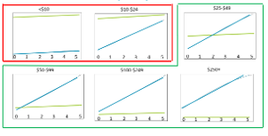 In the charts above, the lime-green line shows the cost to acquire, and the blue line shows the five-year lifetime value (LTV). As you can see, over the course of five years, none of the $0–$24 donors (shown in the charts at the top left surrounded by the red line) produce enough value to cover the initial cost to acquire (they’re net negative for the full five years), whereas those acquired $25+ reach breakeven within 24 months. Generally, the higher the acquisition value, the sooner they recover the expenses associated with acquisition.